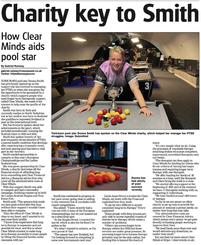 YORK-BORN pool star Donna Smith has previously opened up on the support she has received in managing her PTSD, so when she was given the the opportunity to be sponsored by a charity which supports people who need longer term therapeutic support, called Clear Minds, she made it her mission to help raise the profile of the charity.